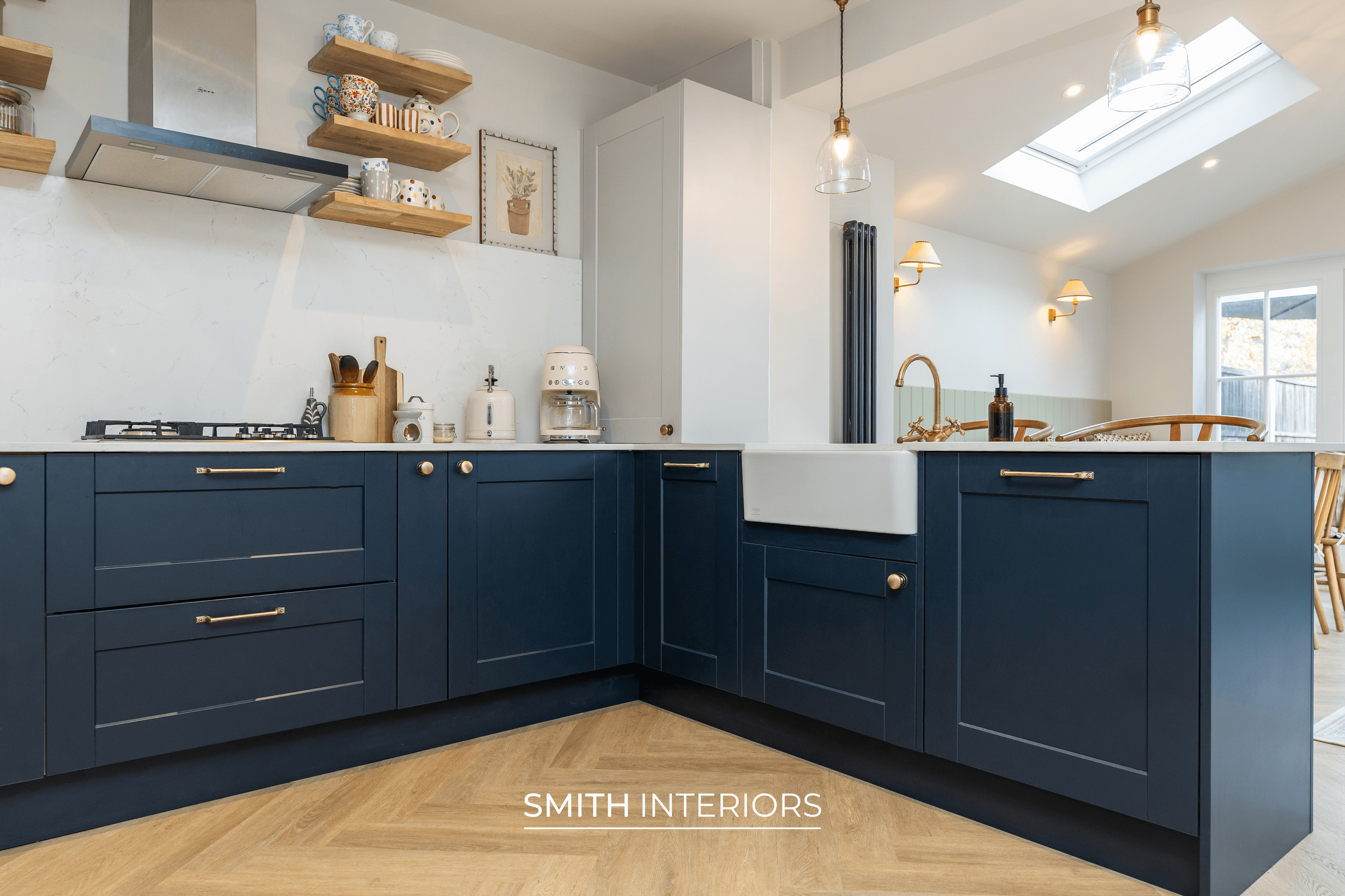 We selected our Belsay Smooth range in Indigo and Dove Grey for the cabinetry, pairing it with a Quartz Carrara Gioia worktop and full splashback for a luxurious finish. Aged brass handles add a touch of vintage glamour, while a classic Belfast sink grounds the design in timeless tradition.