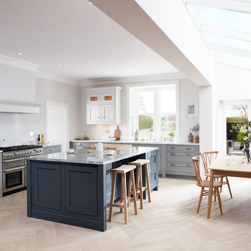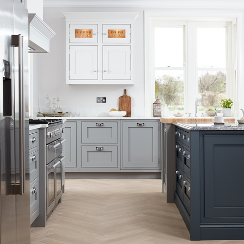 The overall aesthetic of this kitchen complements the intricate frame detailing of our Ovolo door, combining elegant wall panelling, moulded plinth and a herringbone timber floor to exude refinement.