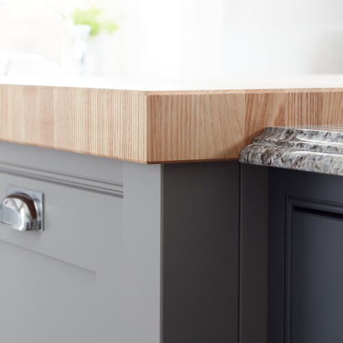 Sitting alongside this, the sumptuous Strata Azul Aran Granite worksurface features waterfall edging to complement the elegance of our Ovolo door.