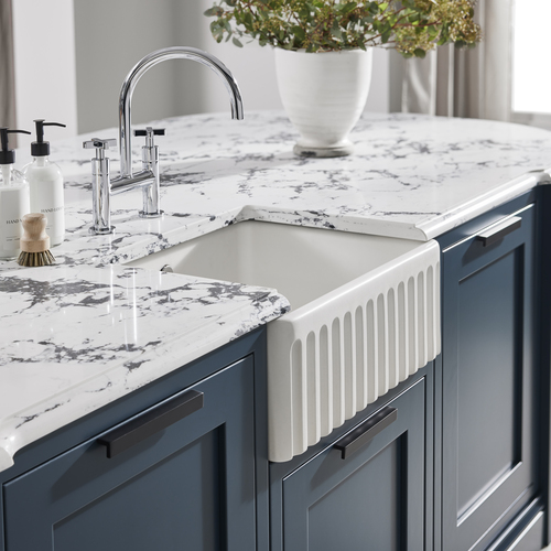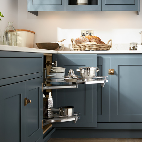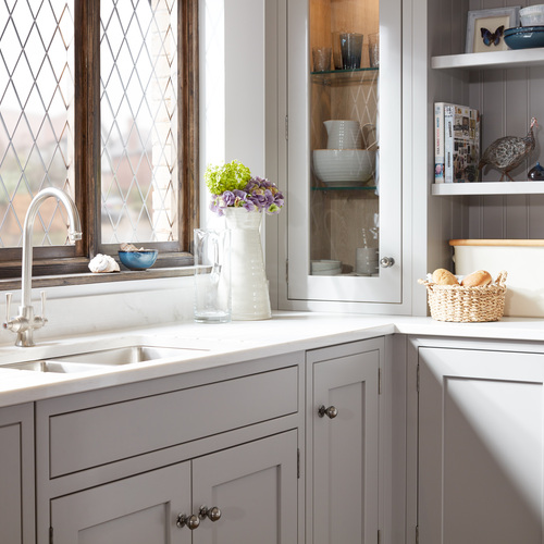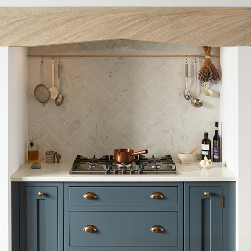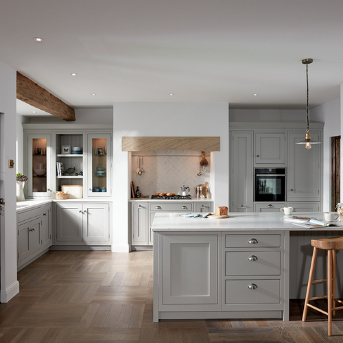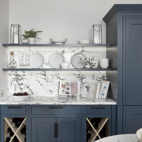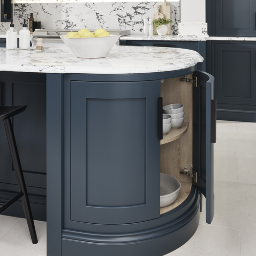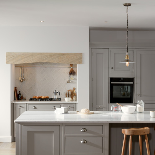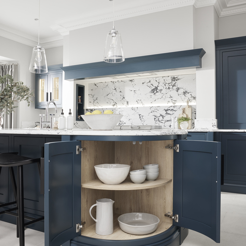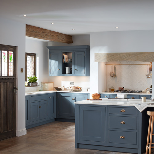 There’s not a colour that doesn’t take to the effortlessly elegant nature of our Shaker doors. Here, in the heritage colour of Storm Blue with Antique Bronze handles, hinges, and a traditional cornice, it shows how Shaker can translate to modern country homes that aren’t afraid of a dash of daring colour. Fancy an alternative to classic wall cabinets? Consider illuminated open shelving and glazed display cabinetry – your kitchen will feel lighter and brighter for it.